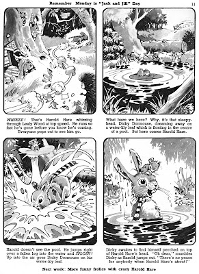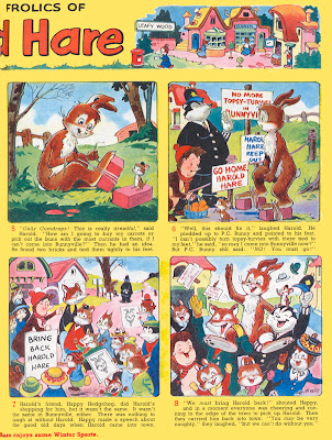 This was 'The Fun and Frolics of Harold Hare'. Harold had been around for some years, first appearing as a background character in a text story written by George E. Rochester for the Knockout Fun Book 1946. The following year, Harold starred in his first solo story and, another year later, Hugh McNeill took over the illustrations. Harold and his neighbours from Wild Wood then starred briefly in a comic strip in Sun July-August 1950, although this was drawn by Harry Hargreaves (another ex-animator); a year later, Roy Davis brought the character back, although his run lasted only seven months from August 1951.