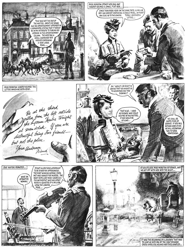 The comic strips are back! We haven't run one for a while as most of my time in front of the computer has been dedicated to scanning book covers from books that I'm getting rid of, plus the occasional cover gallery, knocked together while I have all the books in one place. However, I'm dedicating Sunday evening to cleaning up pages from The Sign of Four, an adaptation of the second of Arthur Conan Doyle's four Sherlock Holmes' novels (it was a sequel to A Study in Scarlet and preceded The Valley of Fear and The Hound of the Baskervilles).
