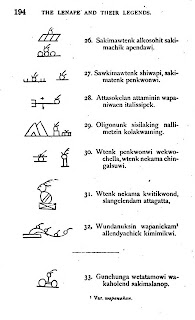 Alternatively, could it be derived from Indian pictogram writing? While looking for information I stumbled upon a book called The Lenâpé and their legends: with the complete texts and symbols of the Walam Olum by Daniel G. Brinton (published in Philadelphia, 1885, online here). The Walam Olum (which Brinton translates as Red Score) is a narrative of the Lenape Native American tribe of Delaware, now thought to be a hoax. However, this is a recent theory and, for 150 years following its first publication in 1836, was thought to be a genuine historical narrative. The book contains Lenape pictograms and text and I couldn't help but read the poorly printed picture 29 which reads "Oligonunk sisilaking nallimetzin kolakwaining" (At the place of caves, in the buffalo land, they at last had food, on a pleasant plain) as "nalli-nictzin".
