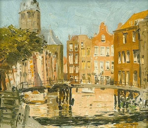 Some of the artists' early post-war travels can be followed through his paintings, which include a harbour scene at Oslo dated 1946 and a canal in Amsterdam dated 1947.