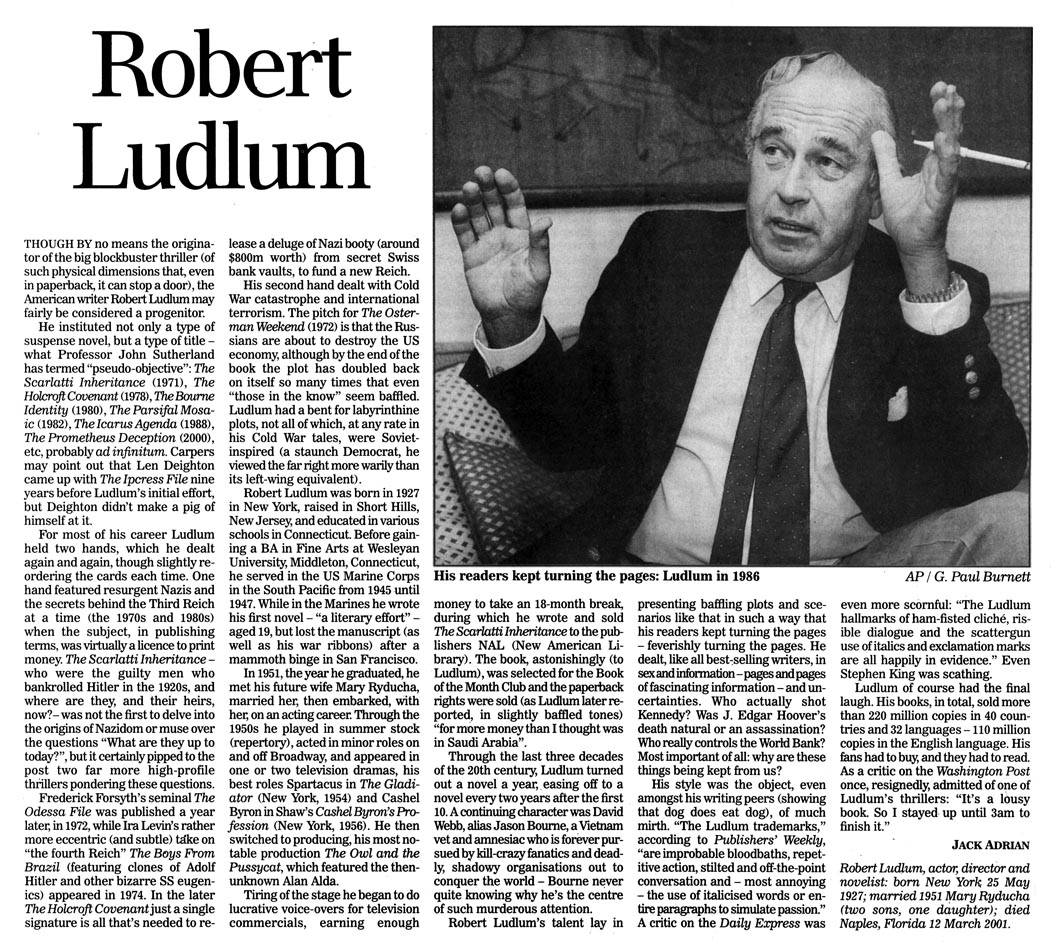 Yet another obituary from the scrapbook. I love the Bourne movies. They gave the thriller a much needed kick up the pants after they had become too effects heavy—the last Pierce Brosnan Bond, for instance, was a disaster. I've enjoyed the revival of Bond with Daniel Craig and I'm looking forward to the latest outing, SPECTRE, which will hopefully not be spoiled by having an unutterably dumb central premise which spoiled an otherwise beautifully shot Skyfall.