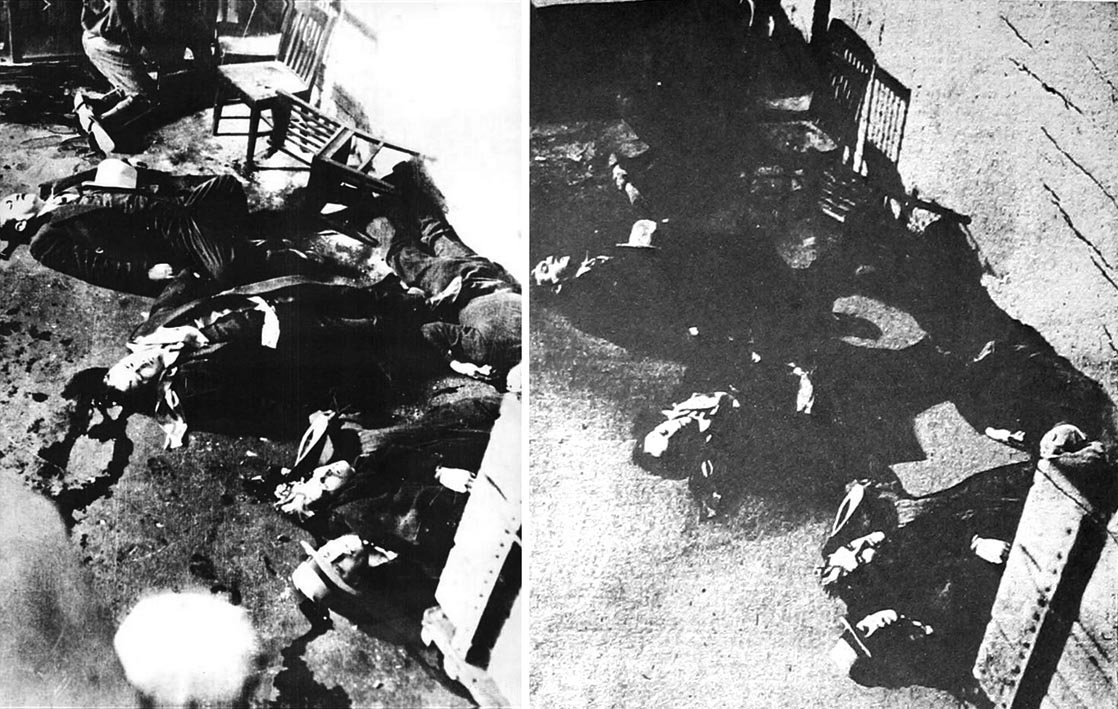 John "Hack" Miller of the Chicago American and Mike Fish of the Chicago Tribune were also on the scene, standing on the roof of a Ford sedan, taking pictures, and other photographers were on the scene. But, like the Daily News, most newspapers carried banner headlines and, if photos appeared, they were pictures of the victims or the surroundings.