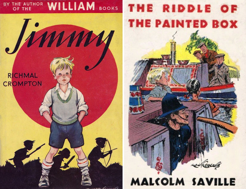 He began to be in demand as a book illustrator after 1944, when he illustrated Malcolm Saville’s Trouble at Townsend. He went on to illustrate a further seven of Saville’s children’s stories, plus novels by authors such as Douglas V. Duff, Angus Macvicar, Judith M. Berrisford, Ursula Bloom, Kathleen Fidler and Gerald Bowman. He also illustrated several books for younger children, including stories by Enid Blyton, and a series of books starring the ventriloquist’s dummy Archie Andrews. In 1949 he illustrated Richmal Crompton’s Jimmy, published by George Newnes (after the stories had earlier been published in The Star newspaper with illustrations by Thomas Henry), followed by Jimmy Again in 1951. (In total, 62 of the 87 “Jimmy” stories were published by George Newnes in these two books, and these were re-issued in three paperbacks by Armada in 1965, under the titles Jimmy, Jimmy Again and Jimmy the Third, all with the Lunt Roberts illustrations. Roberts also illustrated a Just William’s Magic Painting Book).