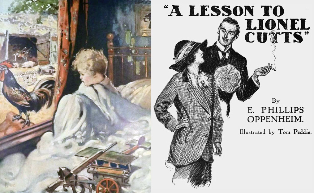 In the meantime, Peddie had begun his career as an illustrator with contributions to The Ludgate Monthly in 1898 and The Penny Pictorial Magazine in 1899. In the first decade of the 20th century his illustrations appeared in Short Stories, The Windsor Magazine, The Sunday Magazine, Good Words and Black and White. In 1908 he began a long association with the boys’ story paper Chums, and two years later he began an even longer association with Cassell’s Magazine (1910-1930), the same publisher’s The New Magazine (1910-1930), the Amalgamated Press’s Red Magazine (1910-1925), and George Newnes’s The Strand Magazine (1910-1929). His work for The Strand included illustrations for three Arthur Conan Doyle stories, “The Three of Them” in 1918, “Billy Bones” in 1922, and “The Maracot Deep” in 1927.