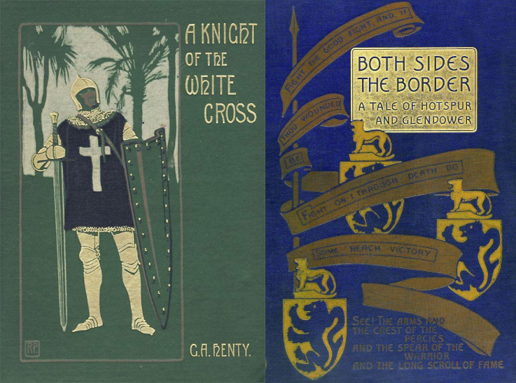 One of his early interests was historical subjects, and his first black and white illustrations appeared in Robert Leighton’s Olaf the Glorious: A Historical Story of the Viking Age, published by Blackie and Son in 1894, and in G.A. Henty’s Wulf the Saxon: A Story of the Norman Conquest, also published by Blackie in 1894 (although the first UK edition is dated 1895). He also designed the cover for this, along with the cover for a re-issue of Henty’s Under Drake’s Flag: A Tale of the Spanish Main (Blackie, 1894). He went on to design the covers for Henty’s At Agincourt: A Tale of the White Hoods of Paris (1897), A March on London: Being a Story of Wat Tyler’s Insurrection (1898), On the Irrawaddy: A Story of the First Burmese War (1898), and Under Wellington’s Command: A Tale of the Peninsular War (1899) – becoming one of the few illustrators at this time to be recognised for their cover designs. He also designed the cover and provided black and white illustrations for Henty’s A Knight of the White Cross: A Tale of the Siege of Rhodes (1896) and Both Sides the Border: A Tale of Hotspur and Glendower (1899). He also illustrated two other historical adventure stories for boys – The Paladins of Edwin the Great by Clements R. Markham (A. & C. Black, 1896), and Lords of the World: A Story of the Fall of Carthage and Corinth by Alfred John Church (Blackie, 1899).