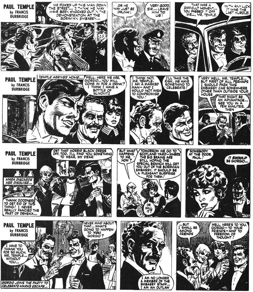 McNamara drew the popular strip until it came to an end on 1 May 1971, during which time Paul Temple underwent a change in appearance so that the character in the newspaper resembled Francis Matthews, who played Temple in the BBC TV series (1969-71). The strip came to an end shortly after the TV show's third season finished.