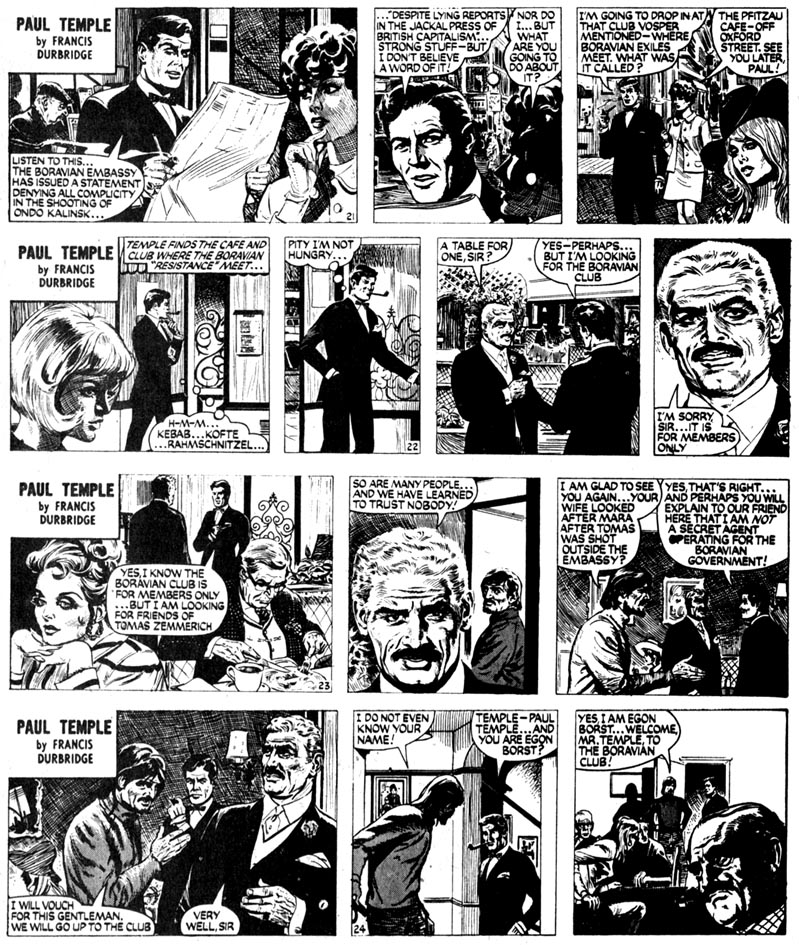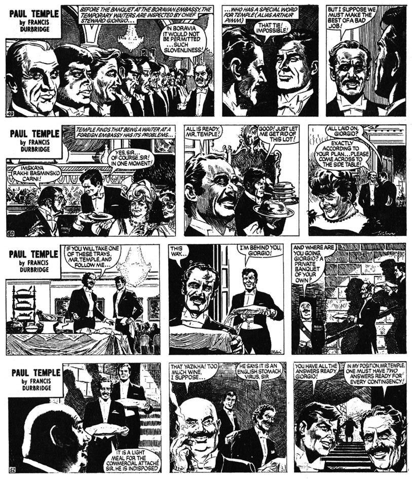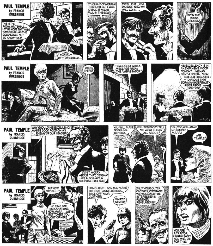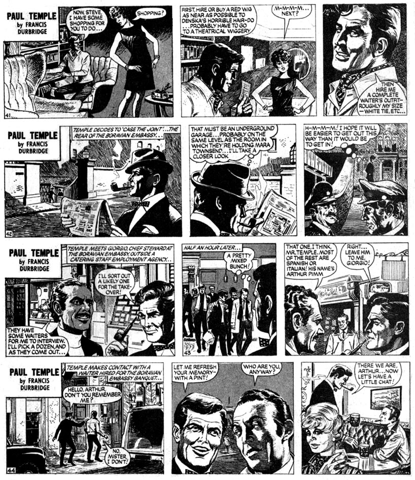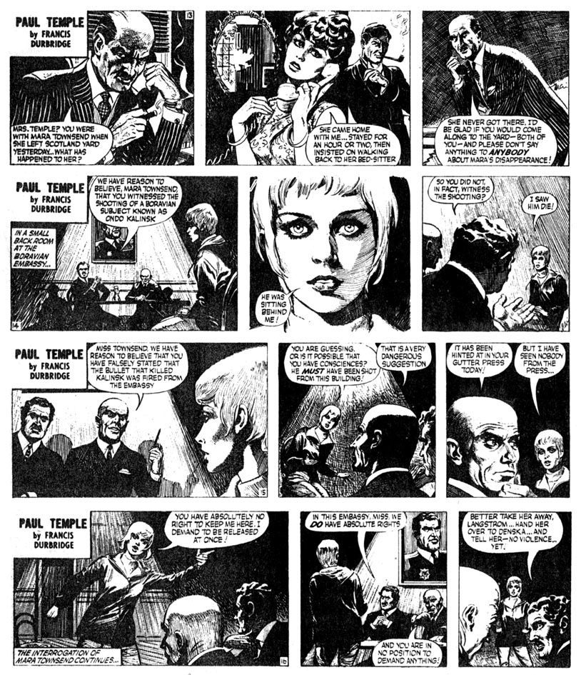 Both characters also had lengthy careers in comics and the Paul Temple strip was greatly influenced by the 52-episode TV series broadcast in 1969-71. Artist John McNamara gradually revised the look of the character in the daily strip to look a little more like the Matthews, as can be seen in the example below from the 1970 serial 'Paul Temple and the Groomgate Killer'. Steve was also given a makeover and was styled after actress Ros Drinkwater, who appeared opposite Matthews in the TV show.